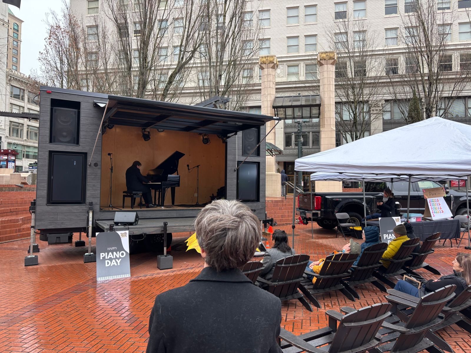 Yes, the rain may have deterred some, but for those who came to hear the music, intentionally or unintentionally, there was utter delight and wonder in hearing the sound of our favorite instrument intermingle with the clang of the Max train, the chatter of passers by, the rumble of traffic. While Filippo Gorini gave his final concert appearance in Oregon after a month of concertizing all around the state, Bill and I were sitting at the back corner of Portland’s living room, at the wrong angle for seeing the piano, but just in the right spot to soak up the sounds while taking in the crowd. And as Filippo tenderly and expertly played Bach, Brahms and Beethoven to the homeless artist scribbling cross-legged on a piece of cardboard, to young couples buying their lunch from the food carts, to toddlers chasing crows, I couldn’t help but think: What a complicated, beautiful world this is – and what a complicated, beautiful machine we have in the piano!