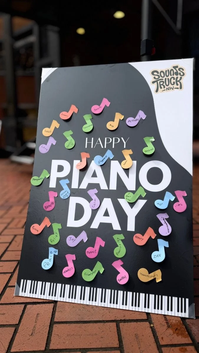 This past Sunday, on the 88th day of the year, we celebrated International Piano Day in cooperation with SoundsTruck NW and Classic Pianos in Pioneer Square. From 11:00–4:00, a host of players ranging from teachers and students to professional pianists took to the stage while, on a large poster, spectators were invited to add sticky notes responding to the question: “In one word, what does piano mean to you?” Read the responses and rejoice: Love, reflection, friendship, flourishing, calm, peace, relief, fun, expression, harmony, zen, presence.